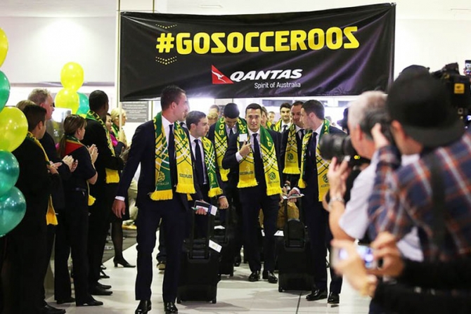 Os Socceroos embarcaram no Aeroporto Internacional de Sydney em um avião personalizado: o canguru que é símbolo da companhia aérea responsável pelo voo carrega em seu pescoço um par de chuteiras.